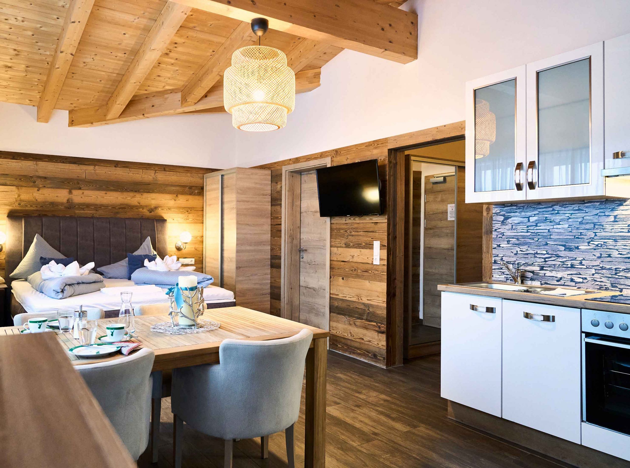 Das Zimmer verfügt über einen Balkon mit Blick auf die Hohe Munde, die Gehrenspitze oder auf Leutasch. Das Studio vereint den Komfort eines Doppelzimmers mit dem kleinen Extra eines Appartements. So können Heißgetränke oder kleine Mahlzeiten selbst zubereitet werden.